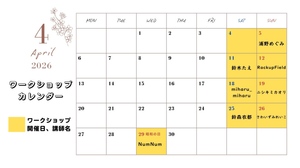 個別開催(予定表にない日程、時間など)、出張開催も承っております。料金などはメールにてお問い合わせください。