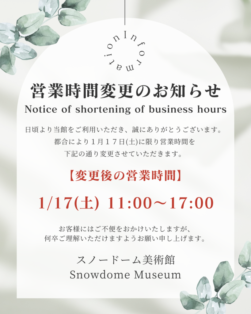 【臨時】営業時間変更のお知らせ 2026年1月15日 最終更新日時 : 2026年1月15日 サイト投稿用アカウントsnowdome_post 1月17日(土)は都合により、下記の通り短縮営業とさせていただきます。 1月17日(土):11:00〜17:00閉店 ご不便をおかけしますが、何卒ご理解のほどよろしくお願い致します。 FacebooktwitterHatenaPocketCopy