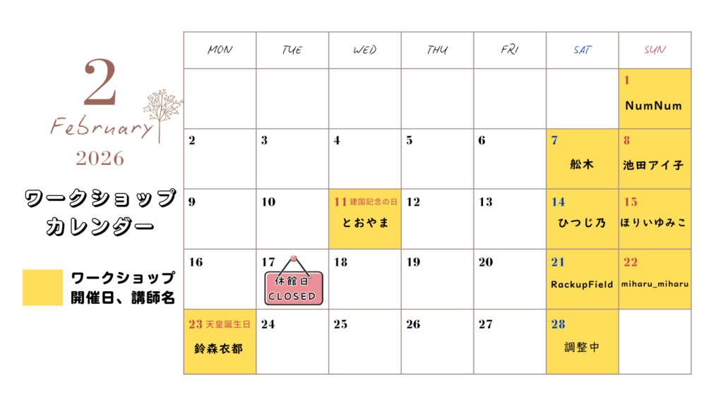 個別開催(予定表にない日程、時間など)、出張開催も承っております。料金などはメールにてお問い合わせください。
