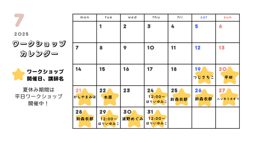 7月のワークショップ予定【平日開催あります】